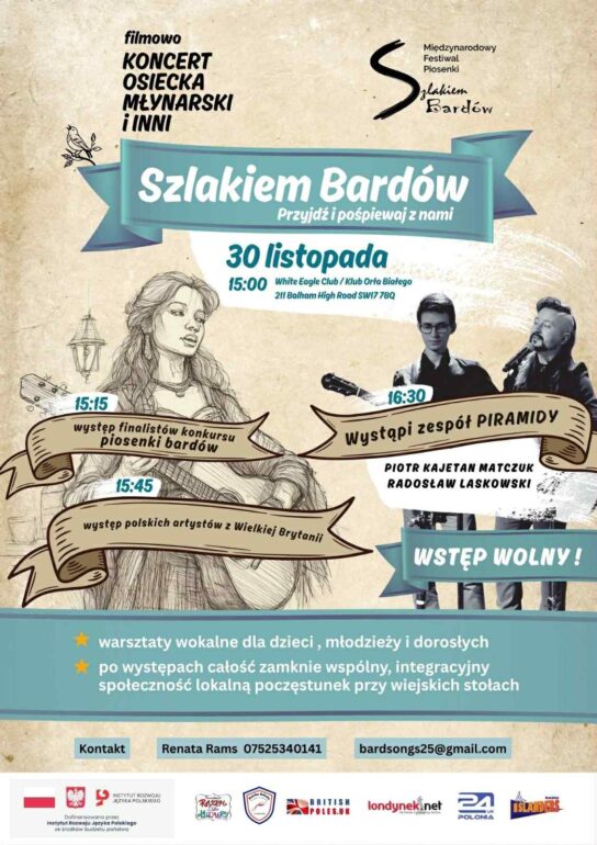 Festiwal „Szlakiem Bardów w Londynie” to niezwykły projekt muzyczno-edukacyjny, który łączy piosenkę literacką, poezję śpiewaną i polską tradycję artystyczną. Wydarzenie skierowane jest do dzieci, młodzieży i dorosłych – wszystkich, którzy kochają muzykę, słowo i kulturę.